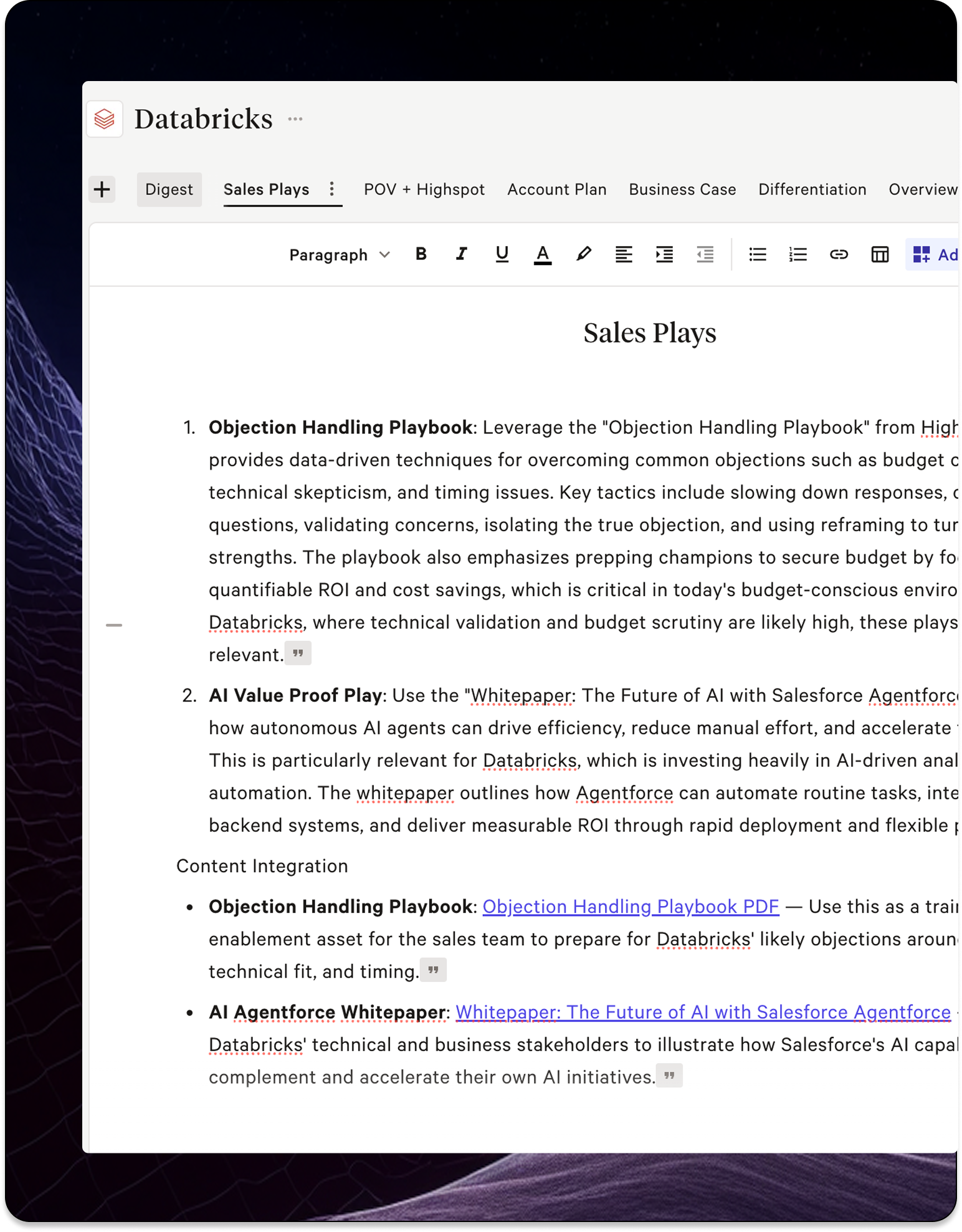 Ensure your AI agents have the right context so they understand your customers’ priorities, needs, and challenges and how your solutions uniquely solve them, so they take the right actions to advance deals forward.