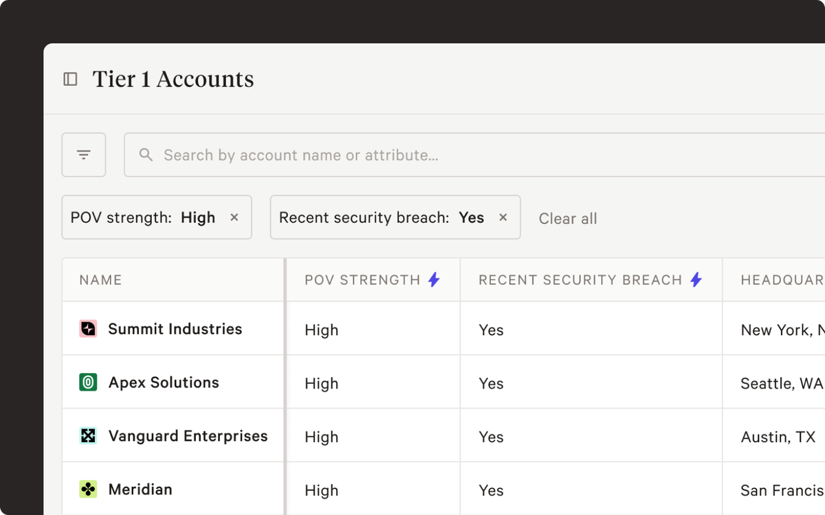 We’re made it easier to focus on your most important accounts. With Saved Views, you can save the preferred setup of your Accounts table—filters, sorting, and column arrangement—so you can instantly jump to the accounts that matter most.