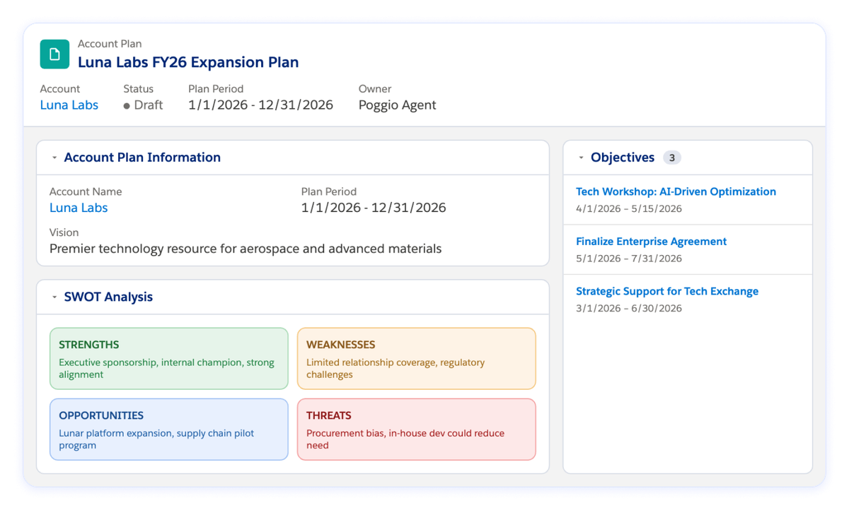 Poggio was deployed more broadly in the company’s most strategic accounts where sellers work cross-functionally and with costly consultants to co-create robust account plans in deep dive sessions. There, Poggio AI agents are surfacing real-time customer needs, synthesizing those against the company’s GTM motion, positioning, and value framework, and then stack-ranking them by strength of the company’s offerings in solving client challenges.
