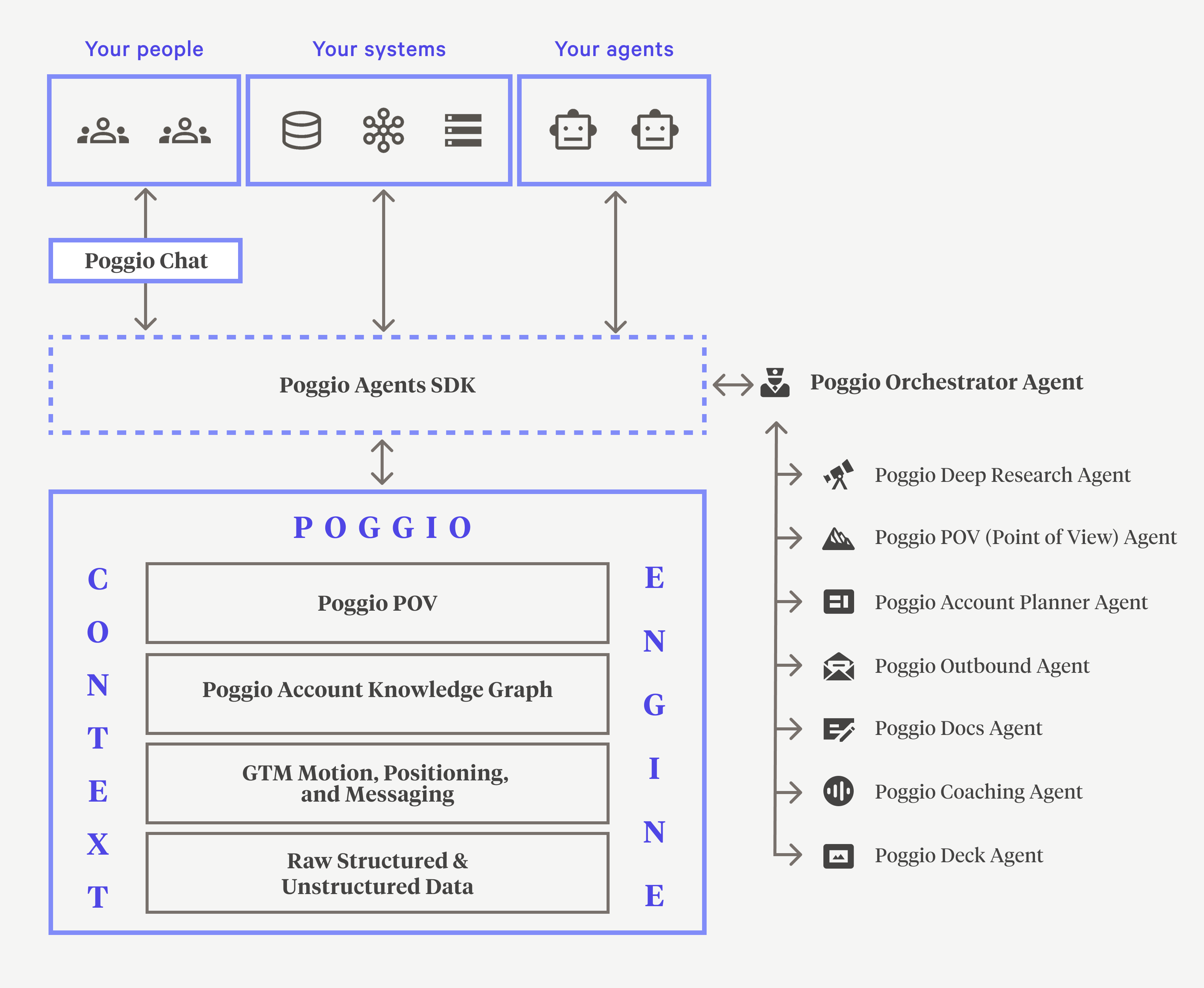 Built for scale and fully extensible, Poggio's intel and POVs flow anywhere directed—to your people in Sales, Customer Success, and Marketing; to your CRM, data warehouse, and other systems; and to your AI agents across your business. Poggio POVs serve as the trusted authority for the real time view and context for every customer, driving insight to action across your entire GTM.