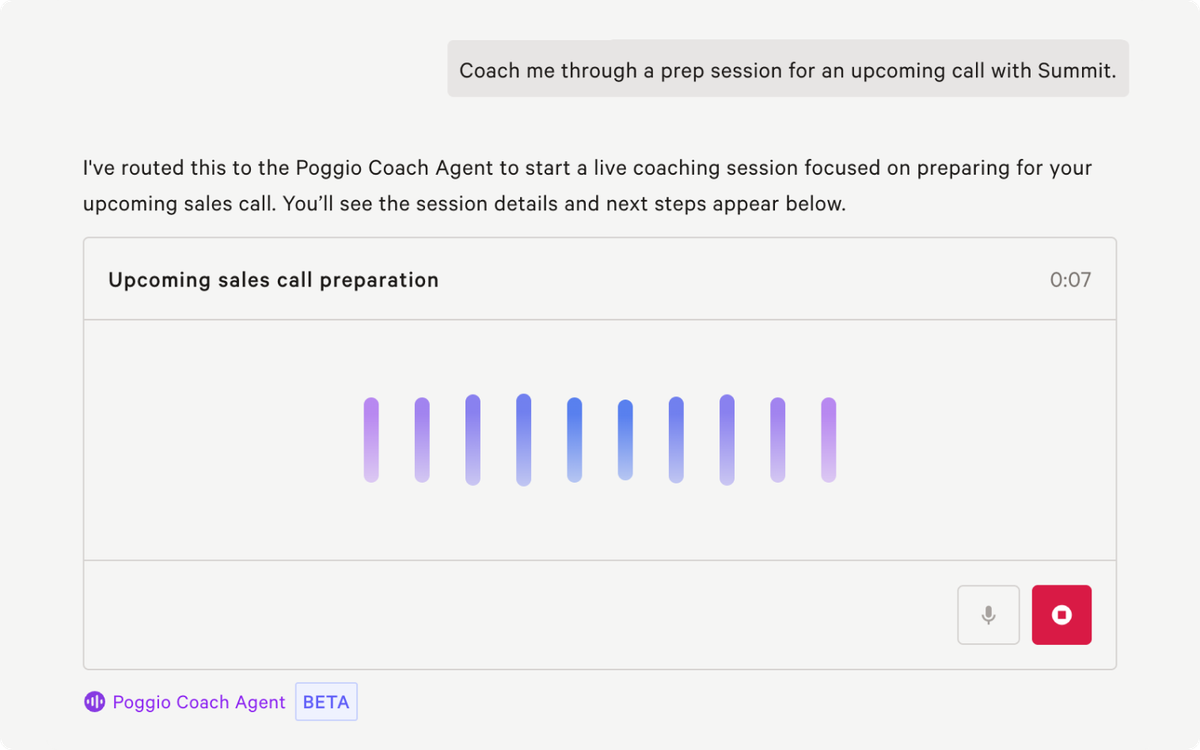 Built as a conversational coach, the new voice mode experience for Poggio’s Coach Agent is now available for beta testing. Sellers can get conversational guidance on their POVs, account plans, and the best sales plays for each account based on Poggio’s real-time intelligence and context.